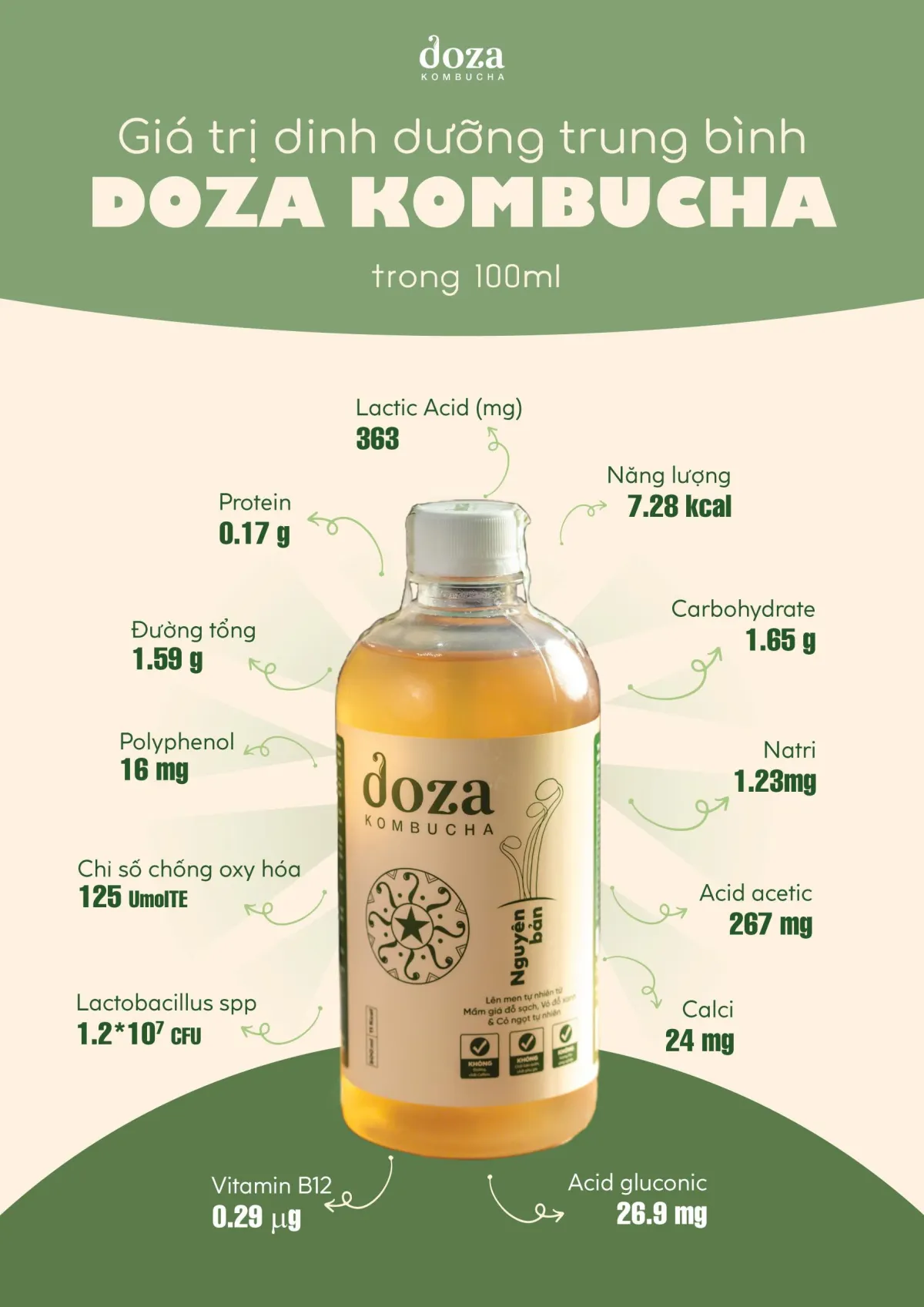 Doza Kombucha là đồ uống lên men hoàn toàn tự nhiên từ Giá đỗ sạch, Vỏ đỗ xanh và Cỏ ngọt. Khác với thuốc chỉ làm dịu triệu chứng – Doza tác động vào gốc của trào ngược: làm lành niêm mạc, phục hồi hệ tiêu hóa, điều hòa trục não – ruột – dạ dày, giảm stress nội sinh, và đặc biệt – cải thiện môi trường bên trong đường tiêu hóa nhờ hàng tỷ lợi khuẩn và enzyme tự nhiên.